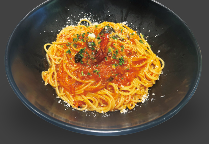 鶏のコクとズッキーニの甘みに、にんにくと唐辛子の辛さを効かせた濃厚トマトクリームのすぱ