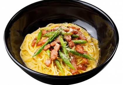 焼きアスパラの濃厚カルボナーラ山椒風味